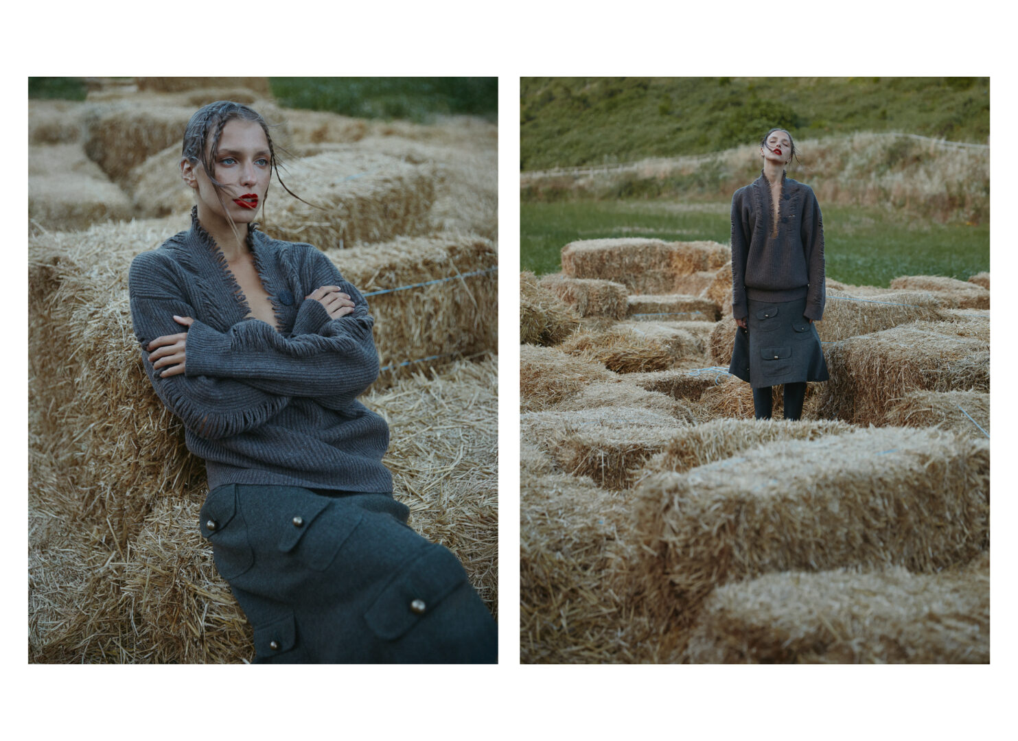 Valeria is wearing sweater By Malene Birger skirt Moschino boots Hunter vintage earrings