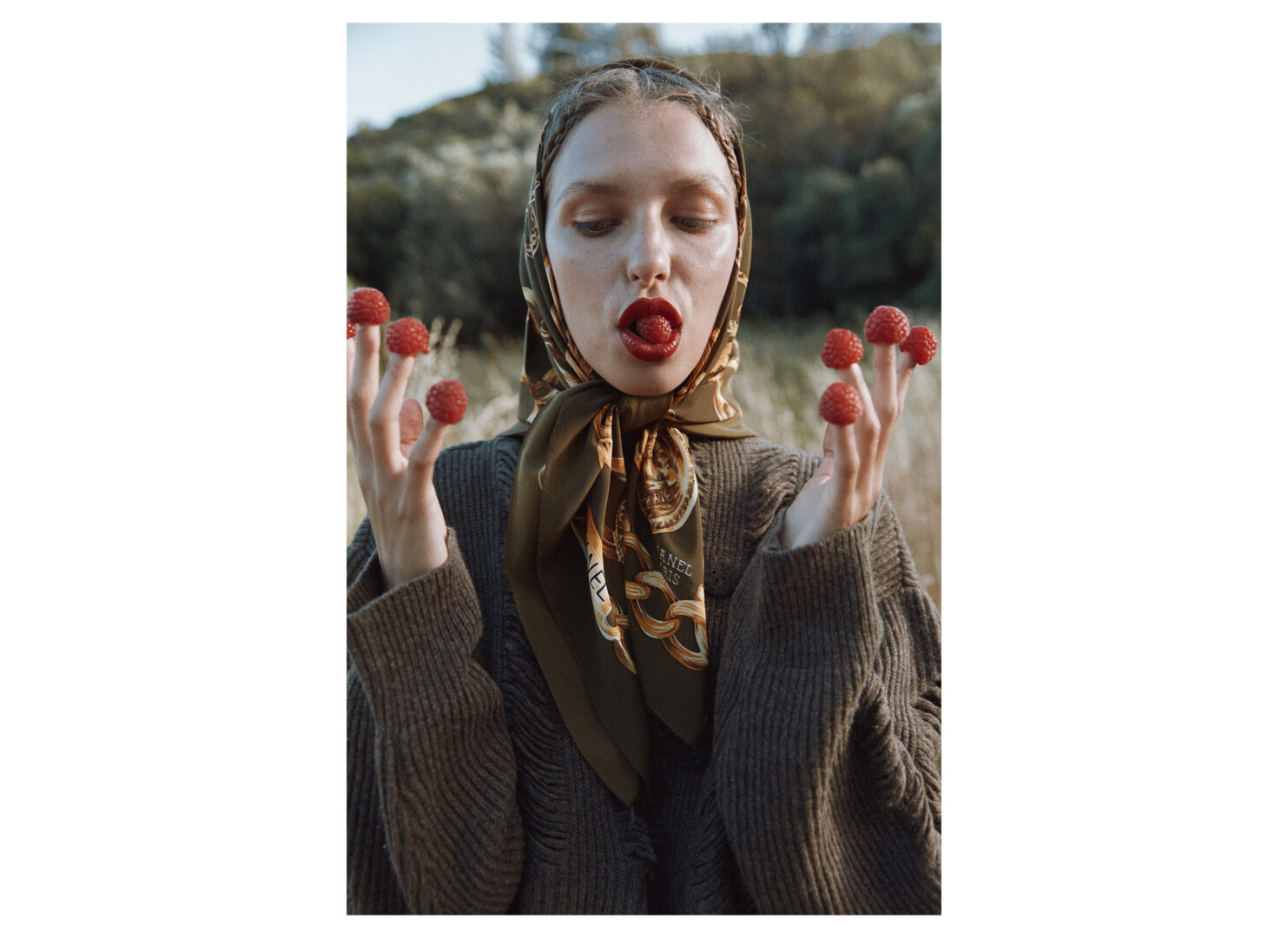 Lera is wearing sweater Issey Miyake skirt Moschino boots Hunter headscarf vintage Chanel