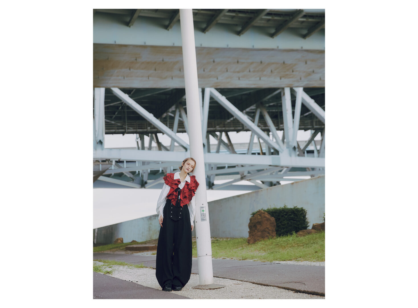Frill neck, Shirt, Pants: FUMIE TANAKA, Shoes: MIDORIKAWA RYO