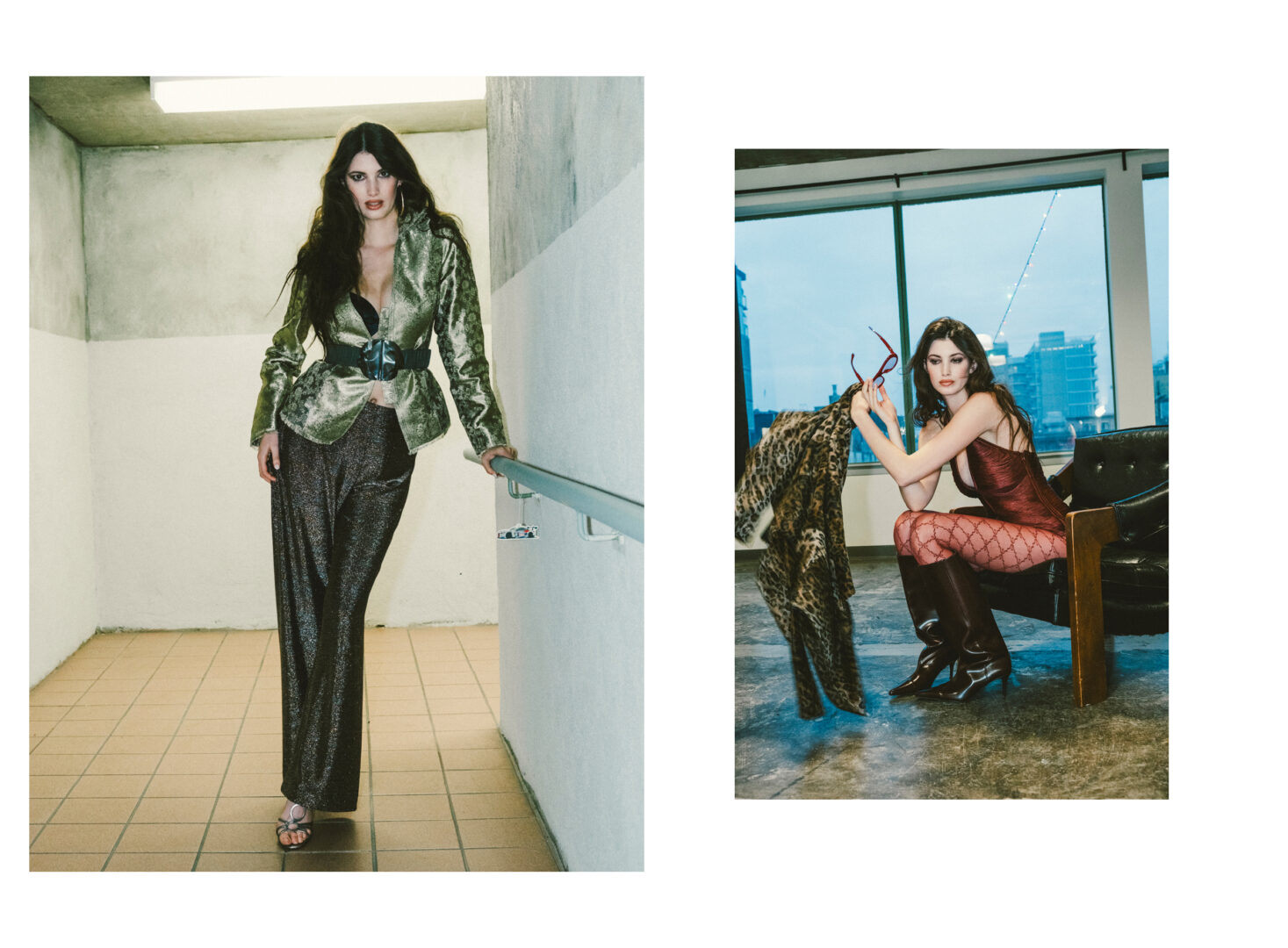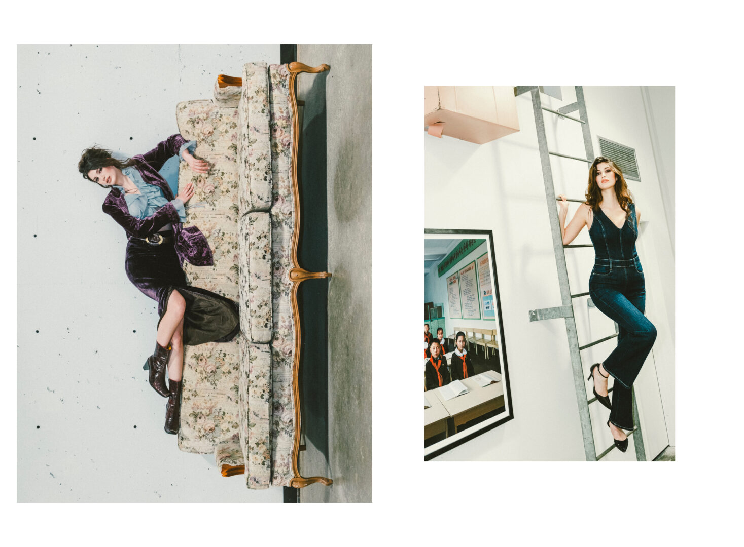 Left:Purple velvet blazer, stylist’s own. Belt, Dolce Gabbana. Skirt, Dries Von Noten. Boots. Sebastiano Migliore