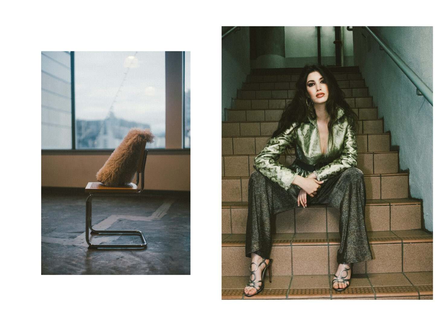 Left: Gold blazer, Nancy Lords. Pants, Seductive from Turnabout Luxury Resale. Shoes, Christian Dior