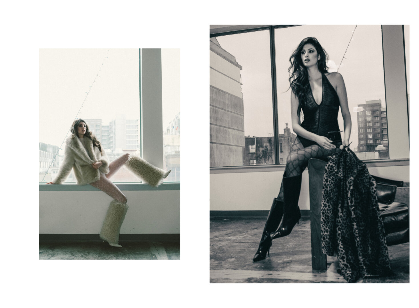 Left: Fur Boots, Steve Madden. Fur coat, Norma Kamali