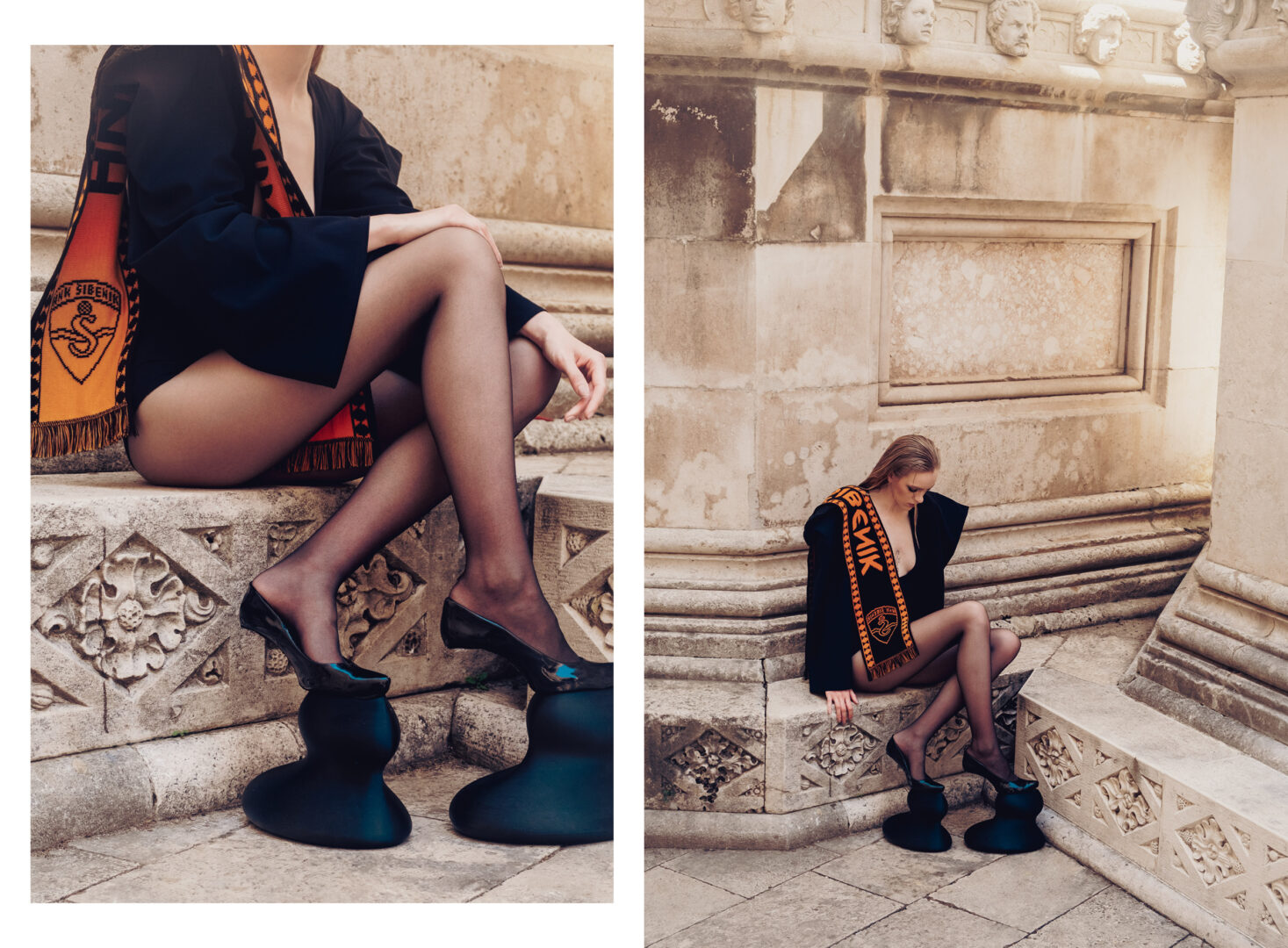 scarf belongs to the Šibenik Football Club, the bodysuit is a design by Patricia Klys @patriciaklys_studio, and the shoes are a unique creation by Daria Dembicka @daria.dembicka.