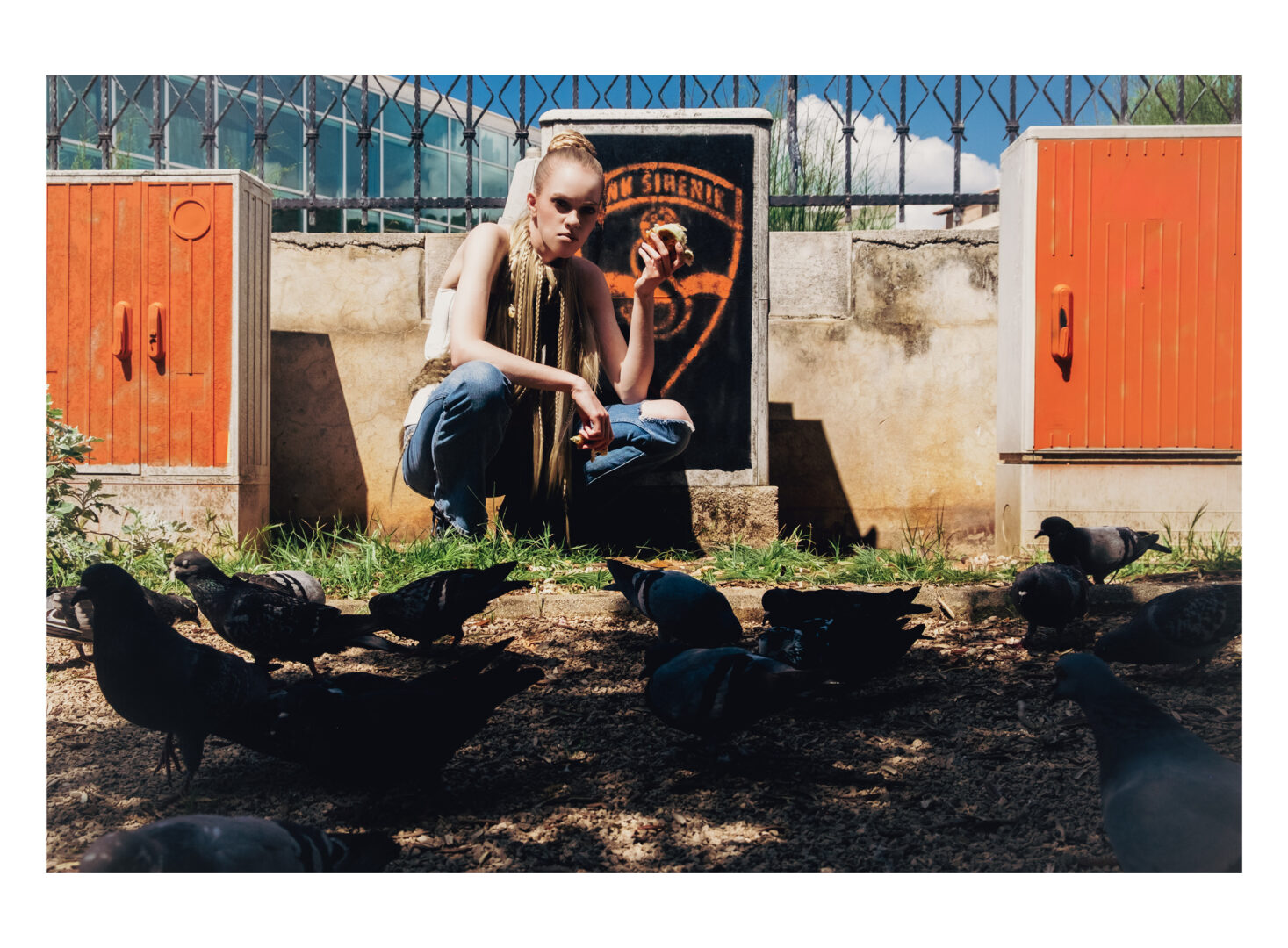 the top is designed by Kamila Wójtowicz @kamilawojtowiczz, the trousers are vintage jeans from the iconic brand American Eagle, and the shoes are made from recycled materials by Alicja Kućmierz of @cityicons_