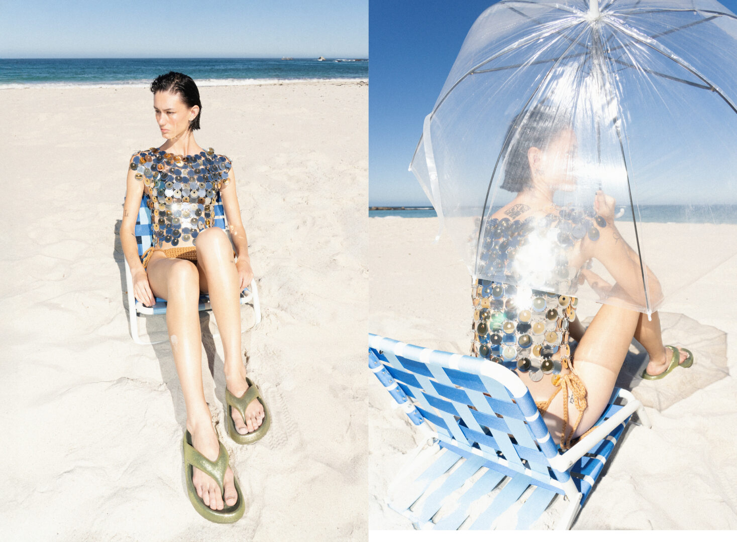 left: Dress: Ashish, Stockings: Nyunyu, Shoes: Charles & Keith