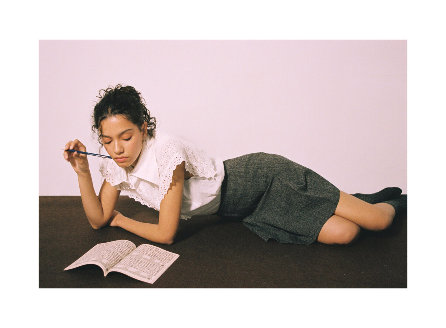 Shirt VÍCTOR VON SUAH, skirt KENZO from La Principal Retro & Co, socks and shoes STYLIST’S OWN, rings and earrings CHARLOTTE LOCAL ARCHIVE.